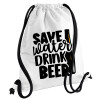 Save Water, Drink BEER, Backpack pouch GYMBAG white, with pocket (40x48cm) & thick cords
