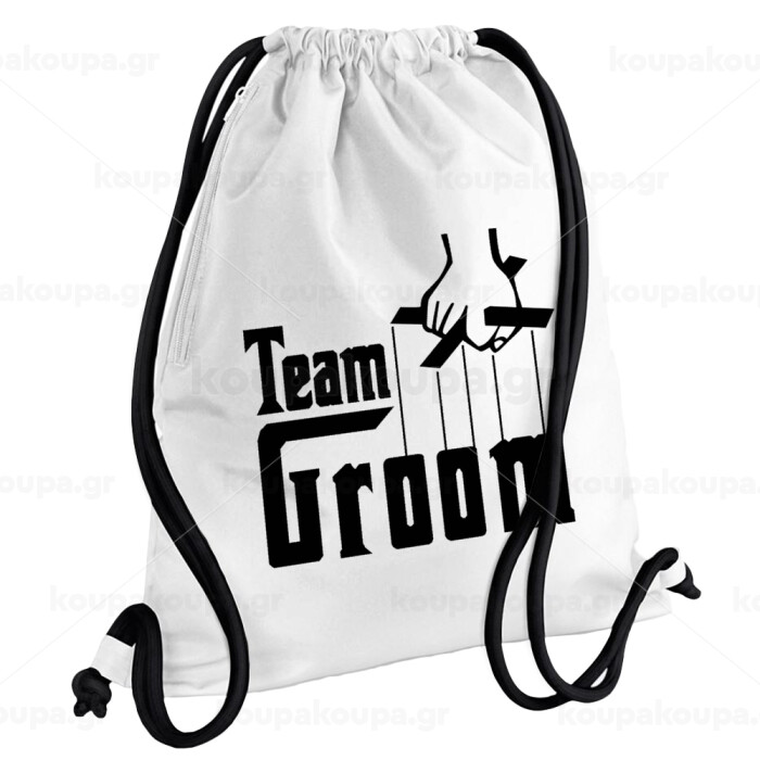 Team Groom, Backpack pouch GYMBAG white, with pocket (40x48cm) & thick cords