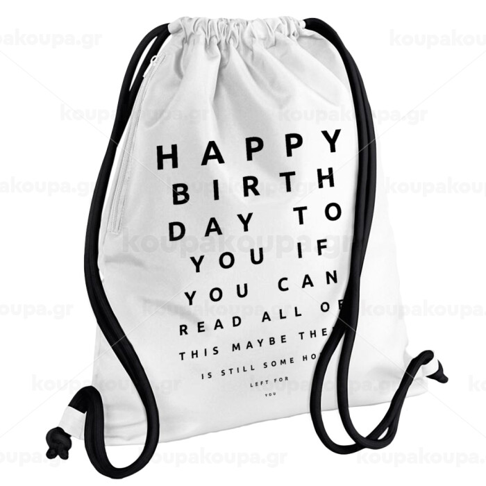EYE tester happy birthday., Backpack pouch GYMBAG white, with pocket (40x48cm) & thick cords