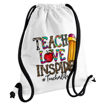 Teach, Love, Inspire, Backpack pouch GYMBAG white, with pocket (40x48cm) & thick cords