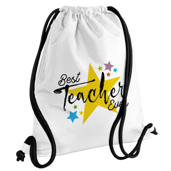 Teacher super star!!!, Backpack pouch GYMBAG white, with pocket (40x48cm) & thick cords