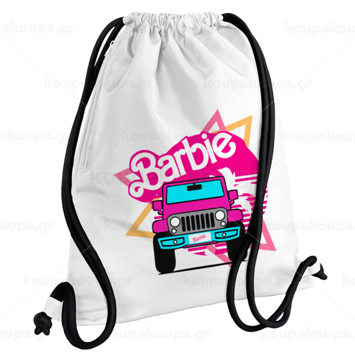 Barbie car, Backpack pouch GYMBAG white, with pocket (40x48cm) & thick cords