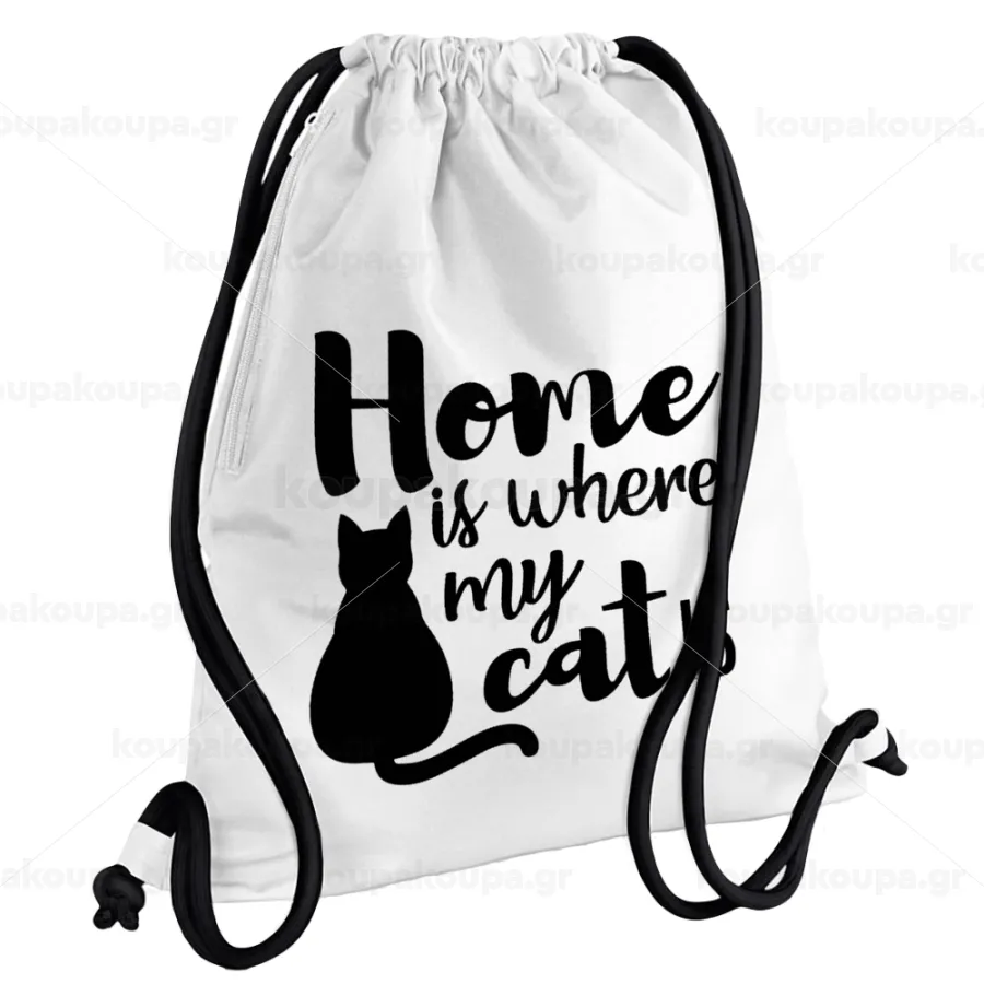 Home is where my cat is!, Backpack pouch GYMBAG white, with pocket (40x48cm) & thick cords