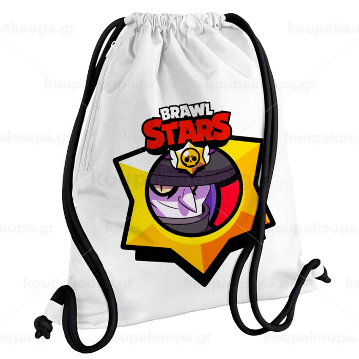 Brawl Stars Mortis, Backpack pouch GYMBAG white, with pocket (40x48cm) & thick cords