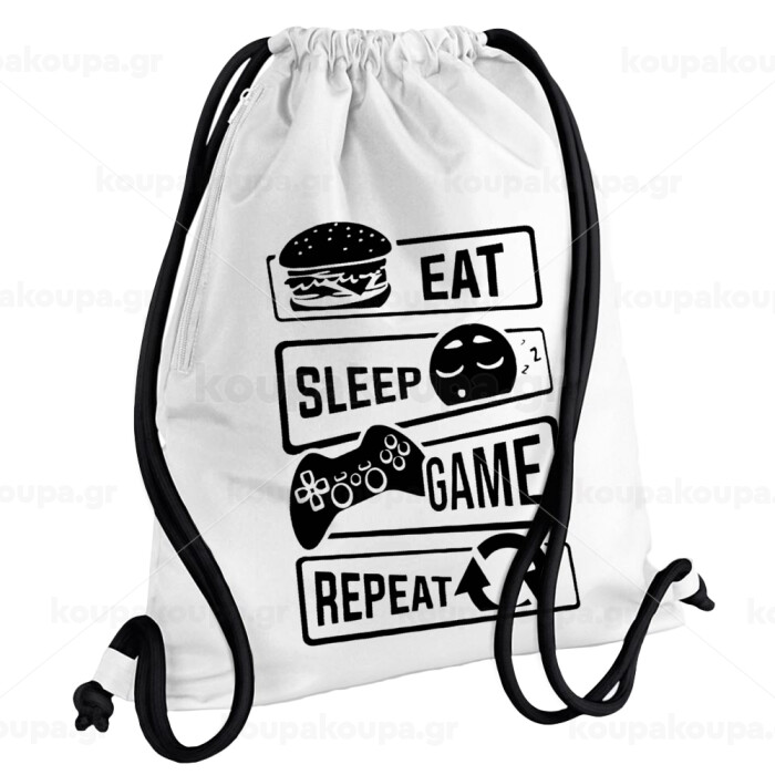 Eat Sleep Game Repeat, Backpack pouch GYMBAG white, with pocket (40x48cm) & thick cords