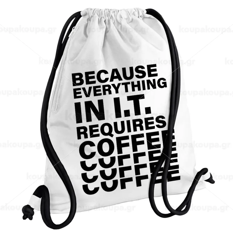 Because everything in I.T. requires coffee, Backpack pouch GYMBAG white, with pocket (40x48cm) & thick cords