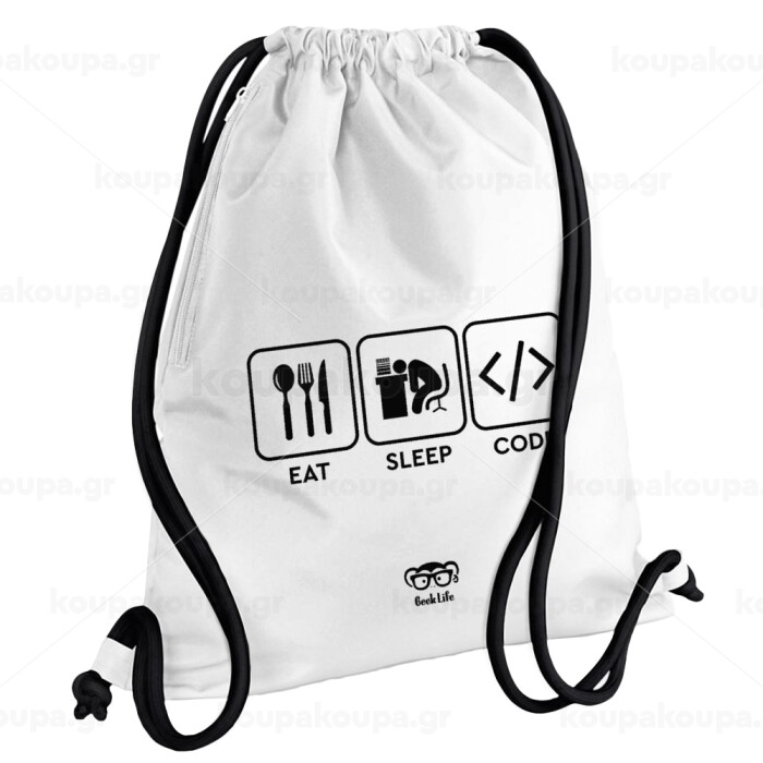 Eat Sleep Code, Backpack pouch GYMBAG white, with pocket (40x48cm) & thick cords