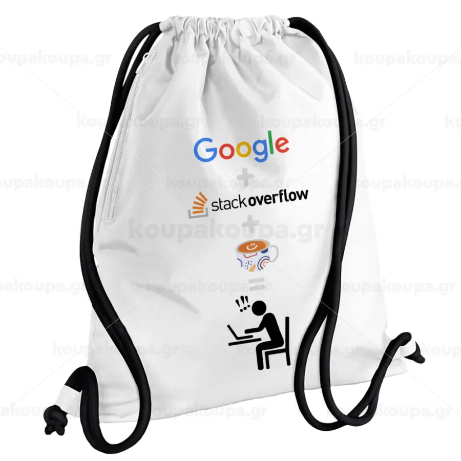 Google + Stack overflow + Coffee, Backpack pouch GYMBAG white, with pocket (40x48cm) & thick cords