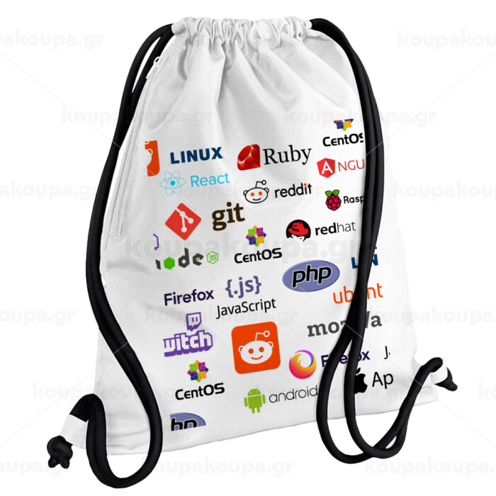 Tech logos, Backpack pouch GYMBAG white, with pocket (40x48cm) & thick cords