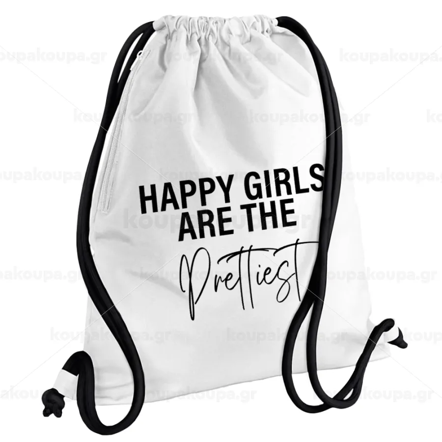 Happy girls are the prettiest, Backpack pouch GYMBAG white, with pocket (40x48cm) & thick cords