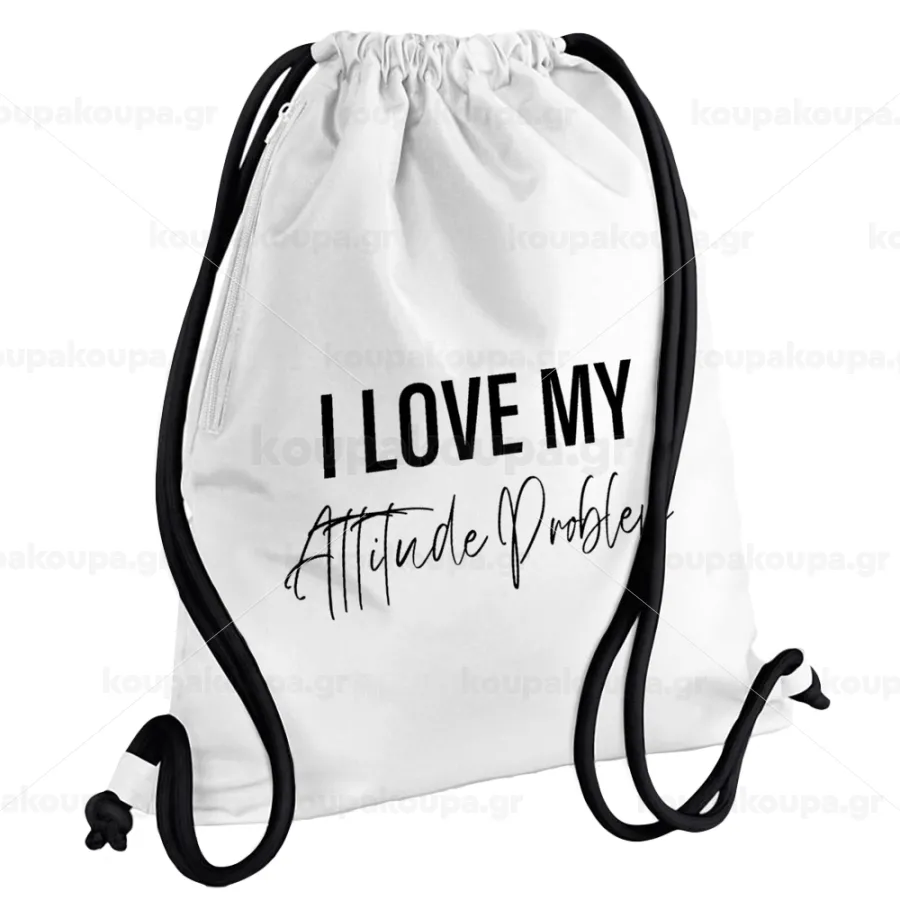 I love my attitude problem, Backpack pouch GYMBAG white, with pocket (40x48cm) & thick cords