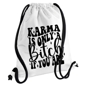 Karma is Only A Bitch if You Are, Backpack pouch GYMBAG white, with pocket (40x48cm) & thick cords
