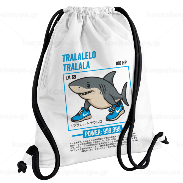 Tralalero Tralala, Backpack pouch GYMBAG white, with pocket (40x48cm) & thick cords