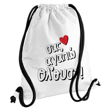 Σας αγαπώ όλ'ουστ!, Backpack pouch GYMBAG white, with pocket (40x48cm) & thick cords