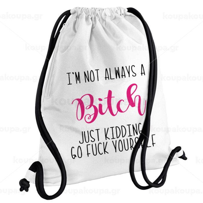 I'm not always a bitch, just kidding go f..k yourself , Backpack pouch GYMBAG white, with pocket (40x48cm) & thick cords