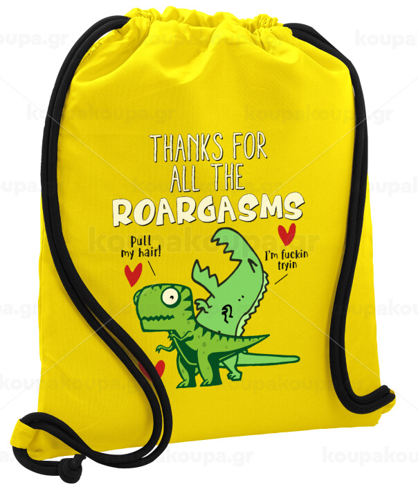 Thanks for all the ROARGASMS, Backpack pouch GYMBAG Yellow, with pocket (40x48cm) & thick cords