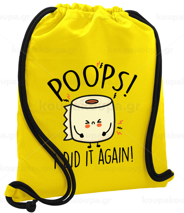 Poops!...I Did It Again, Backpack pouch GYMBAG Yellow, with pocket (40x48cm) & thick cords