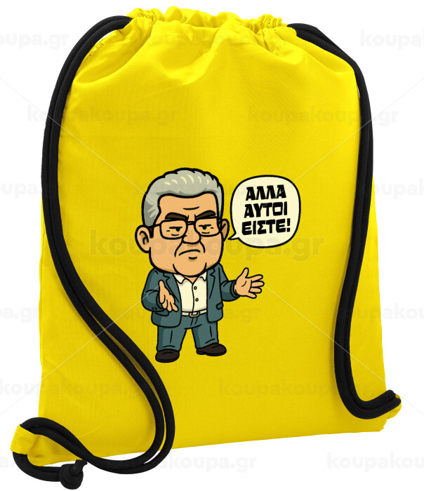 Κουτσούμπας, "Αλλά αυτοί είστε!", Backpack pouch GYMBAG Yellow, with pocket (40x48cm) & thick cords