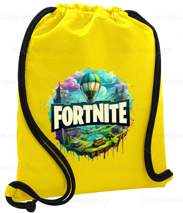 Fortnite land, Backpack pouch GYMBAG Yellow, with pocket (40x48cm) & thick cords
