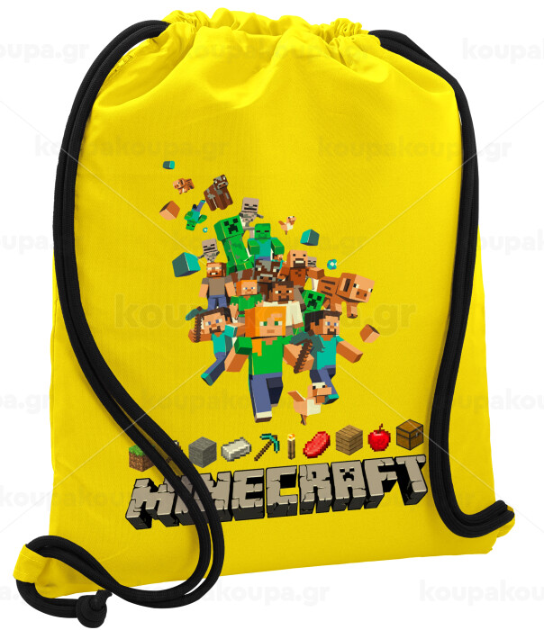 Minecraft adventure, Backpack pouch GYMBAG Yellow, with pocket (40x48cm) & thick cords