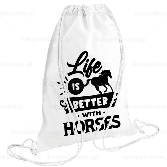 Life is Better with a Horses, Backpack pouch GYMBAG white (28x40cm)