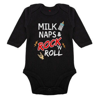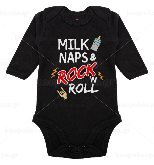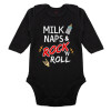 milk naps and Rock n' Roll, Μακρυμάνικο βρεφικό φορμάκι, 0-18 μηνών, ΜΑΥΡΟ, 100% Organic Cotton