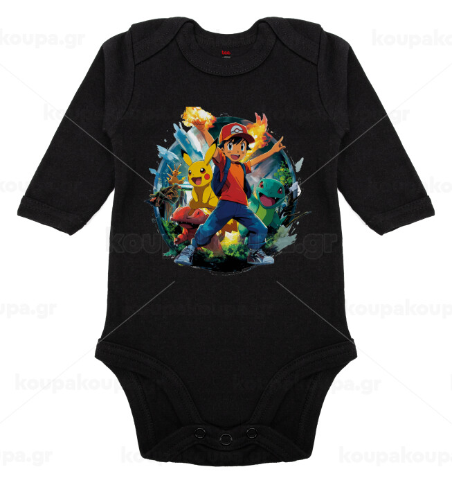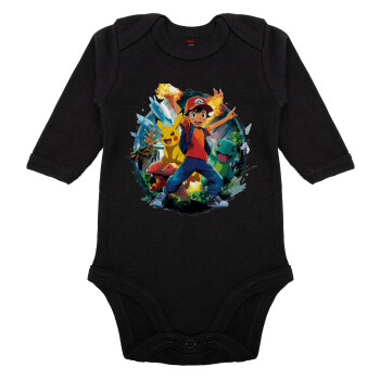 Ash Ketchum & Pikachu, Μακρυμάνικο βρεφικό φορμάκι, 0-18 μηνών, ΜΑΥΡΟ, 100% Organic Cotton