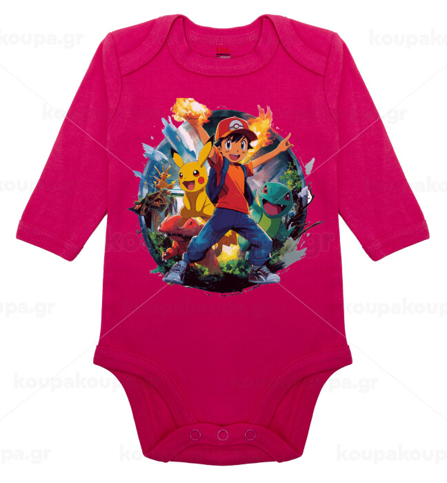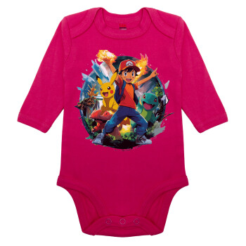 Ash Ketchum & Pikachu, Μακρυμάνικο βρεφικό φορμάκι, 0-18 μηνών, ΡΟΖ, 100% Organic Cotton
