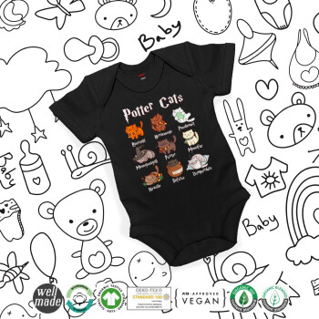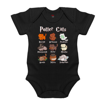 Potter Cats, Βρεφικό φορμάκι μωρού, 0-18 μηνών, ΜΑΥΡΟ, 100% Organic Cotton, κοντομάνικο