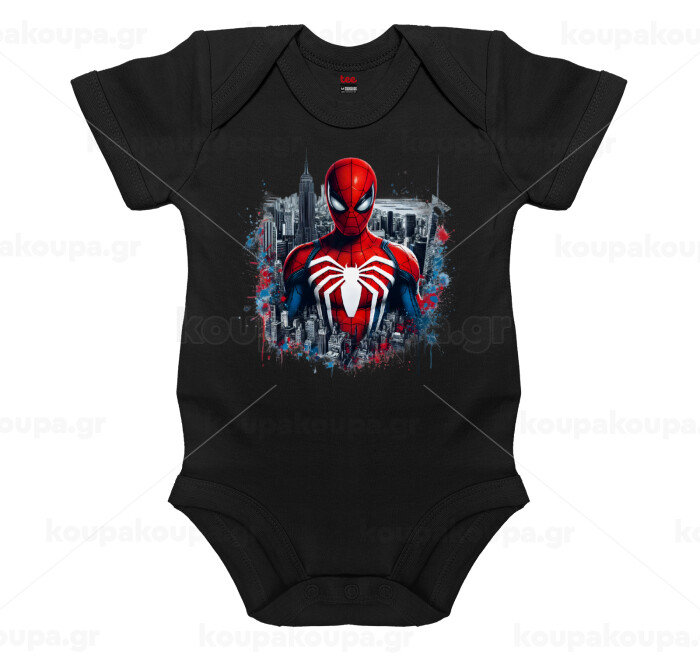 Spiderman City, Βρεφικό φορμάκι μωρού, 0-18 μηνών, ΜΑΥΡΟ, 100% Organic Cotton, κοντομάνικο