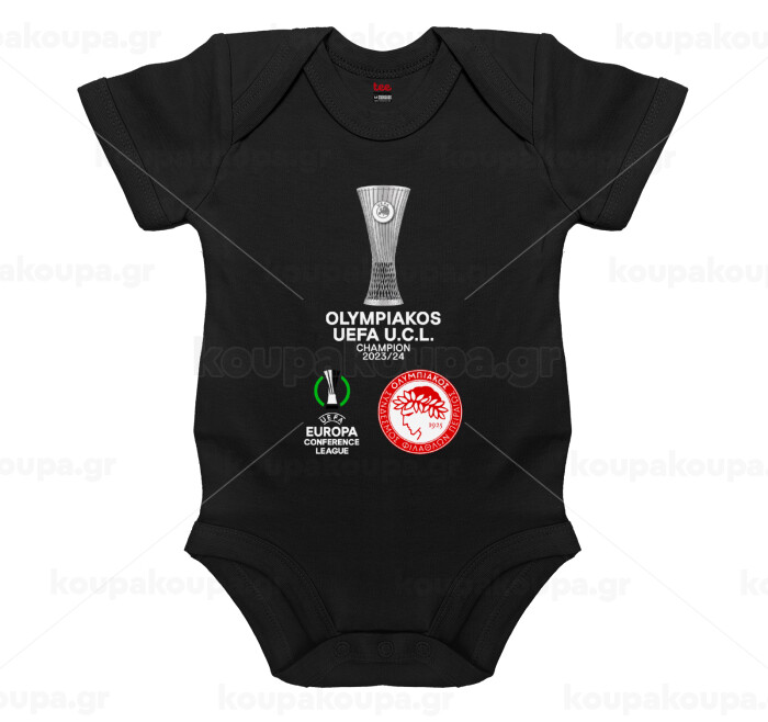 Olympiacos UEFA Europa Conference League Champion 2023/24, Βρεφικό φορμάκι μωρού, 0-18 μηνών, ΜΑΥΡΟ, 100% Organic Cotton, κοντομάνικο