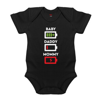BABY, MOMMY, DADDY Low battery, Βρεφικό φορμάκι μωρού, 0-18 μηνών, ΜΑΥΡΟ, 100% Organic Cotton, κοντομάνικο