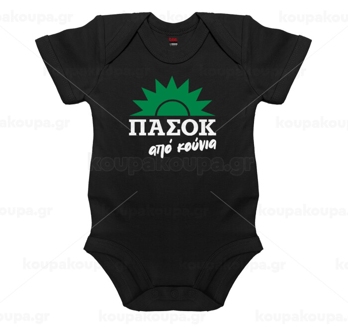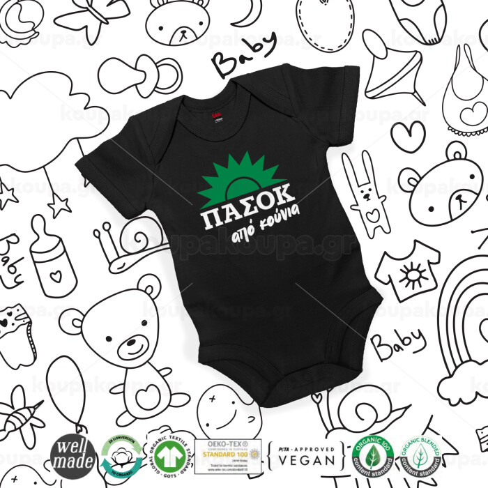 ΠΑΣΟΚ από κούνια, Βρεφικό φορμάκι μωρού, 0-18 μηνών, ΜΑΥΡΟ, 100% Organic Cotton, κοντομάνικο