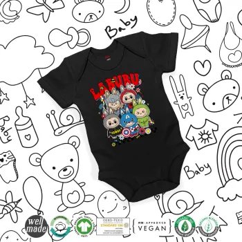 Labubu superheroes, Βρεφικό φορμάκι μωρού, 0-18 μηνών, ΜΑΥΡΟ, 100% Organic Cotton, κοντομάνικο
