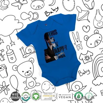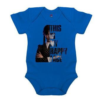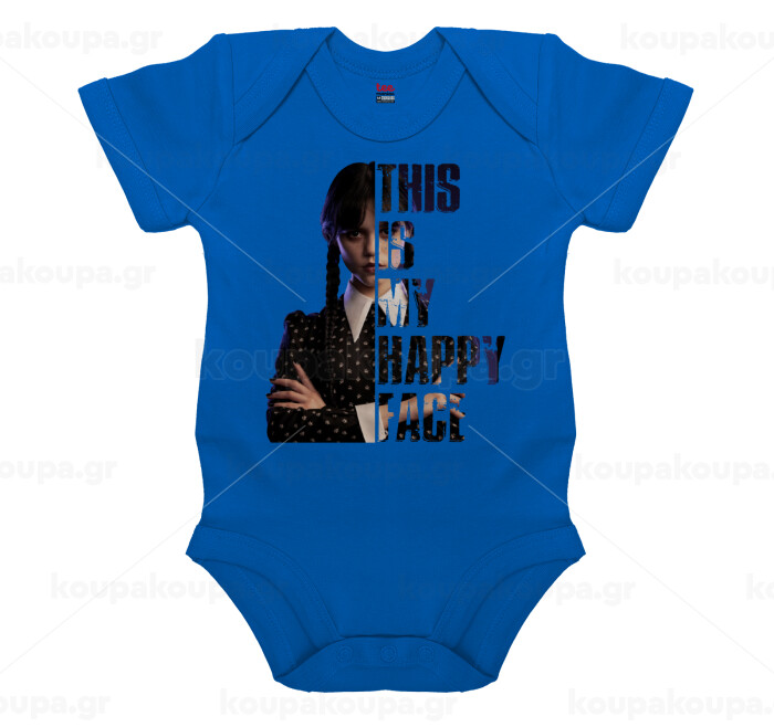 Wednesday, This is my happy face, Βρεφικό φορμάκι μωρού, Μπλε Κοβαλτίου, 100% Organic Cotton, κοντομάνικο