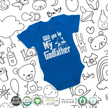 Will You Be My Godfather, Βρεφικό φορμάκι μωρού, Μπλε Κοβαλτίου, 100% Organic Cotton, κοντομάνικο