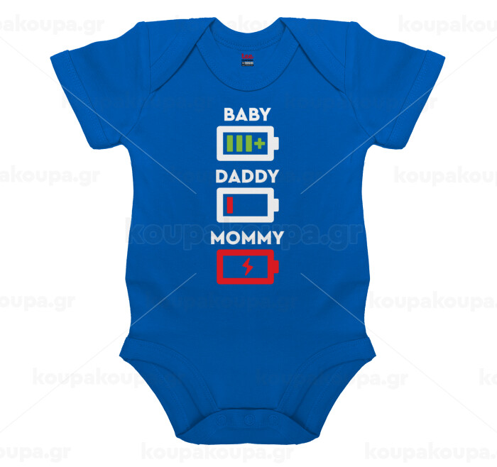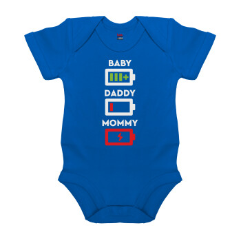 BABY, MOMMY, DADDY Low battery, Βρεφικό φορμάκι μωρού, Μπλε Κοβαλτίου, 100% Organic Cotton, κοντομάνικο