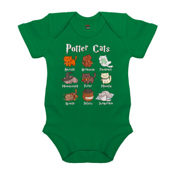 Potter Cats, Βρεφικό φορμάκι μωρού, ΠΡΑΣΙΝΟ, 100% Organic Cotton, κοντομάνικο