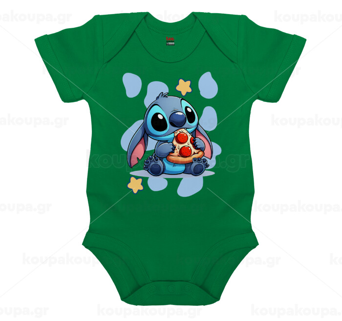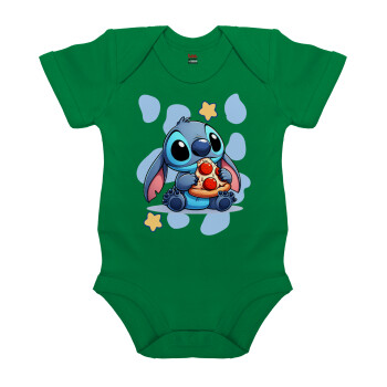 Stitch Pizza, Βρεφικό φορμάκι μωρού, ΠΡΑΣΙΝΟ, 100% Organic Cotton, κοντομάνικο