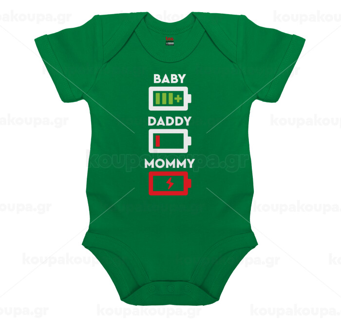 BABY, MOMMY, DADDY Low battery, Βρεφικό φορμάκι μωρού, ΠΡΑΣΙΝΟ, 100% Organic Cotton, κοντομάνικο