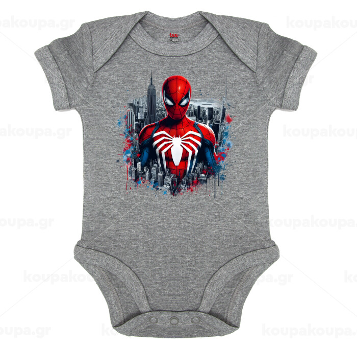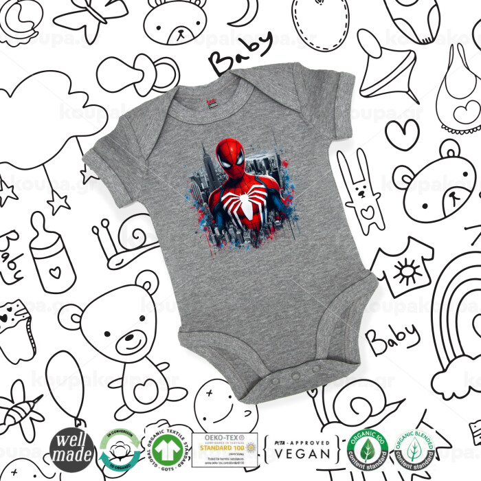 Spiderman City, Βρεφικό φορμάκι μωρού, 0-18 μηνών, ΓΚΡΙ ΜΕΛΑΝΖΕ, 100% Organic Cotton, κοντομάνικο