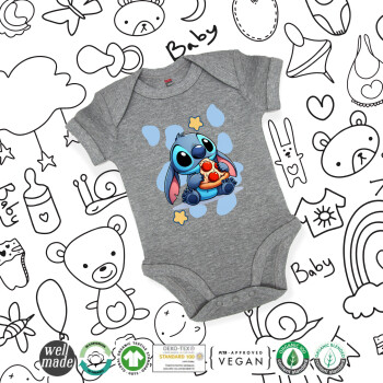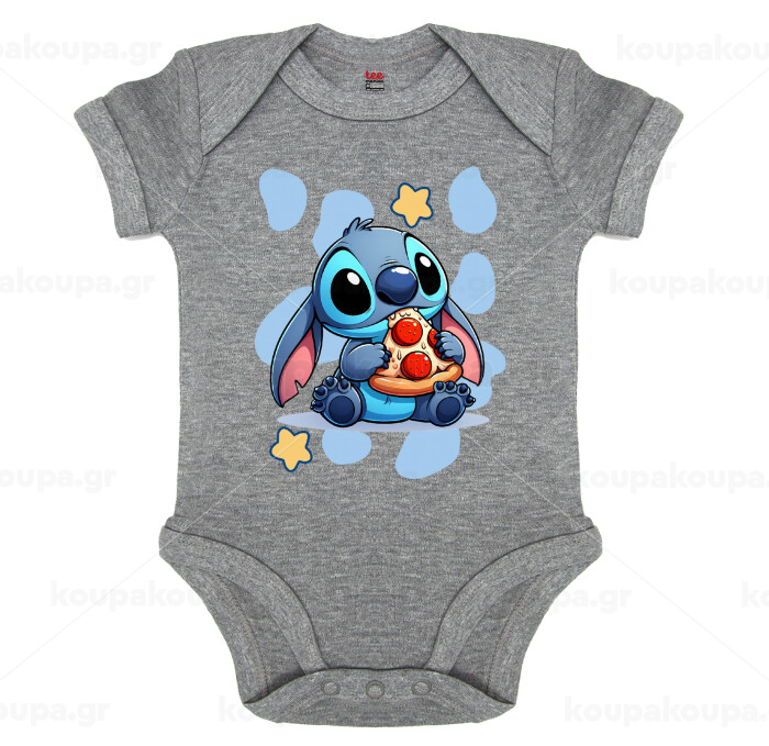 Stitch Pizza, Βρεφικό φορμάκι μωρού, 0-18 μηνών, ΓΚΡΙ ΜΕΛΑΝΖΕ, 100% Organic Cotton, κοντομάνικο
