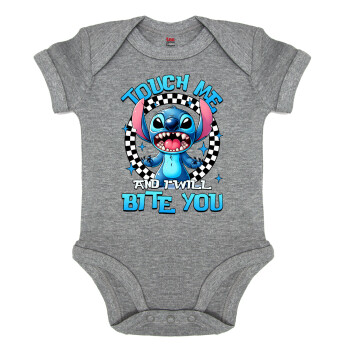 Stitch Touch Me And I Will Bite You, Βρεφικό φορμάκι μωρού, 0-18 μηνών, ΓΚΡΙ ΜΕΛΑΝΖΕ, 100% Organic Cotton, κοντομάνικο