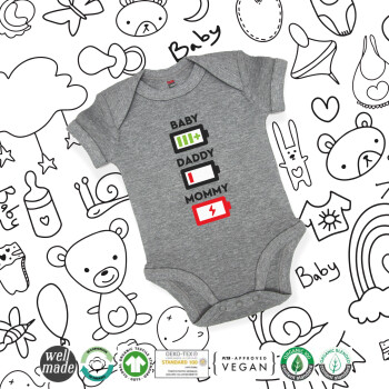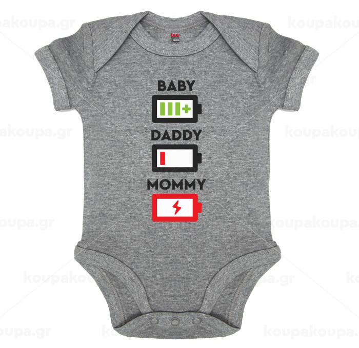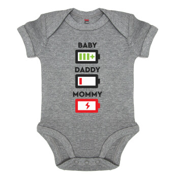 BABY, MOMMY, DADDY Low battery, Βρεφικό φορμάκι μωρού, 0-18 μηνών, ΓΚΡΙ ΜΕΛΑΝΖΕ, 100% Organic Cotton, κοντομάνικο