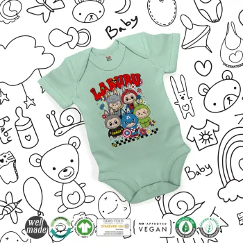 Labubu superheroes, Βρεφικό φορμάκι μωρού, 0-18 μηνών, mint (Μέντα), 100% Organic Cotton, κοντομάνικο