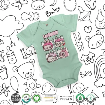 Labubu pink, Βρεφικό φορμάκι μωρού, 0-18 μηνών, mint (Μέντα), 100% Organic Cotton, κοντομάνικο