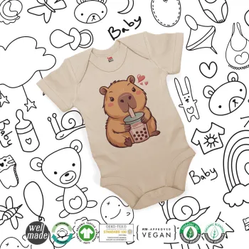 Capybara Bubble Tea, Βρεφικό φορμάκι μωρού, 0-18 μηνών, Natural (Εκρού), 100% Organic Cotton, κοντομάνικο