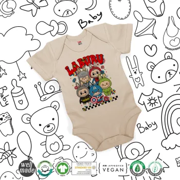 Labubu superheroes, Βρεφικό φορμάκι μωρού, 0-18 μηνών, Natural (Εκρού), 100% Organic Cotton, κοντομάνικο