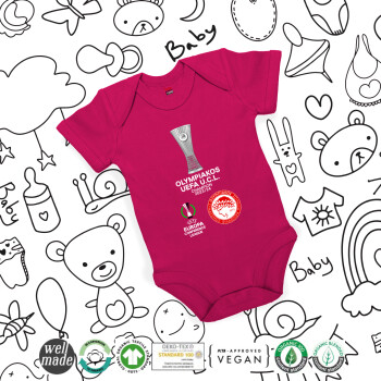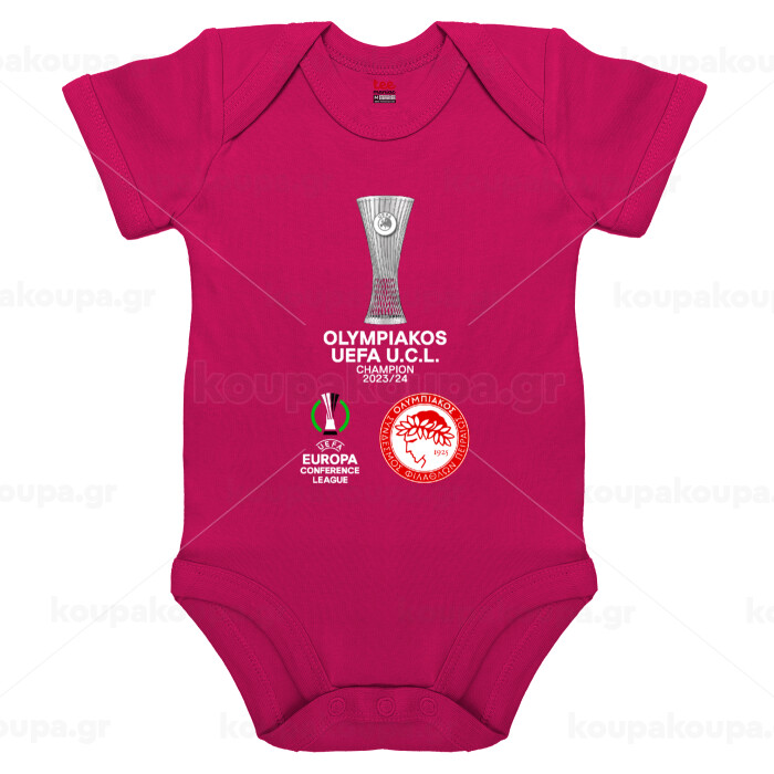 Olympiacos UEFA Europa Conference League Champion 2023/24, Βρεφικό φορμάκι μωρού, 0-18 μηνών, ΡΟΖ, 100% Organic Cotton, κοντομάνικο
