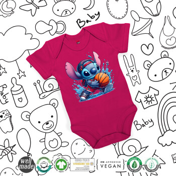 Stitch Basketball, Βρεφικό φορμάκι μωρού, 0-18 μηνών, ΡΟΖ, 100% Organic Cotton, κοντομάνικο
